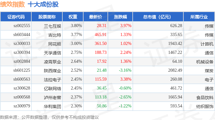 绩效指数(399398)十大成份股详情如下: