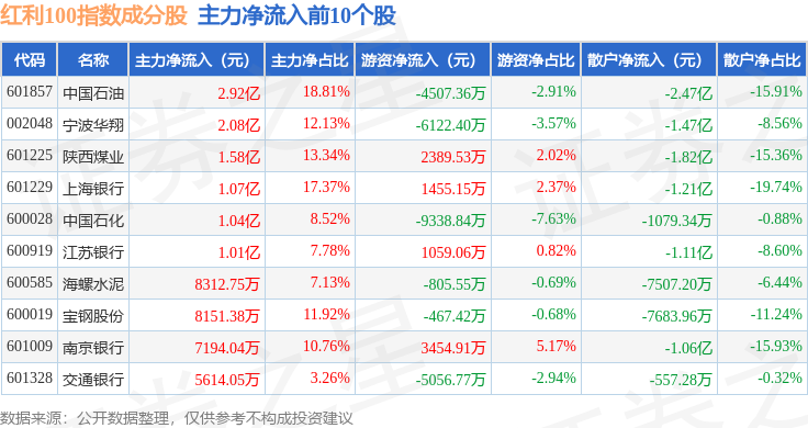 资金流向方面,红利100(399411)指数成份股当日主力资金净流出合计7.78亿元,游资资金净流入合计2.19亿元,散户资金净流入合计5.59亿元。成份股资金流向详情见下表: