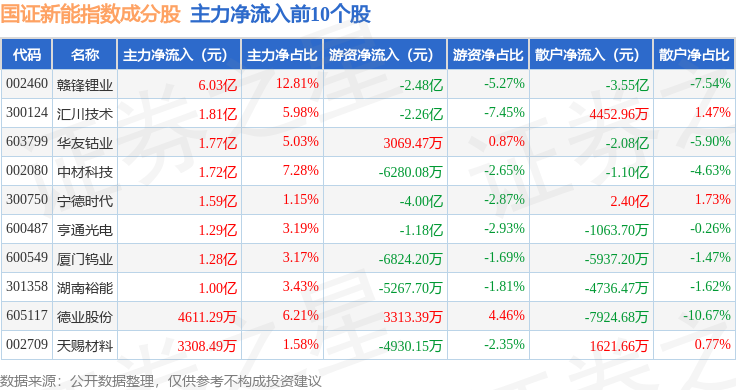 资金流向方面,国证新能(399412)指数成份股当日主力资金净流出合计20.96亿元,游资资金净流出合计10.16亿元,散户资金净流入合计31.11亿元。成份股资金流向详情见下表: