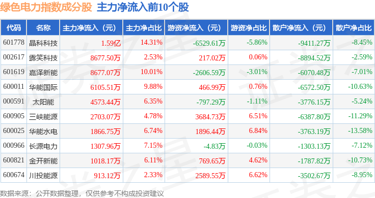 资金流向方面,绿色电力(399438)指数成份股当日主力资金净流出合计7.94亿元,游资资金净流出合计6611.47万元,散户资金净流入合计8.6亿元。成份股资金流向详情见下表: