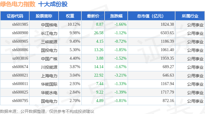 绿色电力(399438)指数十大成份股详情如下: