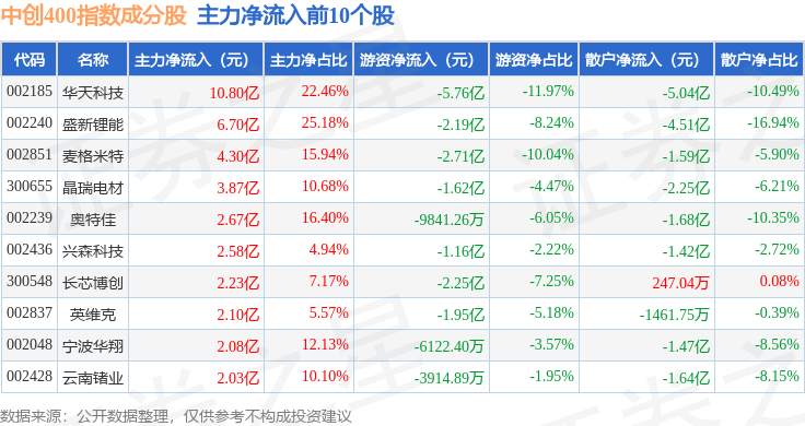 资金流向方面,中创400(399624)指数成份股当日主力资金净流出合计6.08亿元,游资资金净流出合计15.56亿元,散户资金净流入合计21.65亿元。成份股资金流向详情见下表: