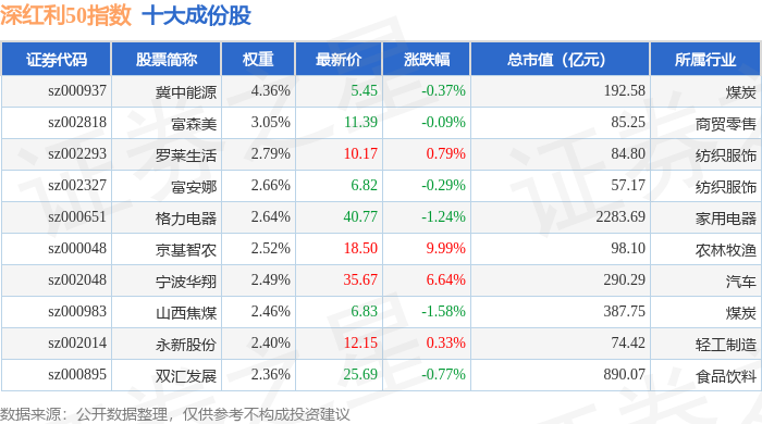深红利50(399672)指数十大成份股详情如下: