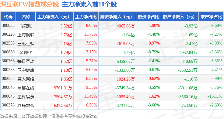 资金流向方面,深互联EW(399677)指数成份股当日主力资金净流出合计13.06亿元,游资资金净流入合计4.24亿元,散户资金净流入合计8.82亿元。成份股资金流向详情见下表: