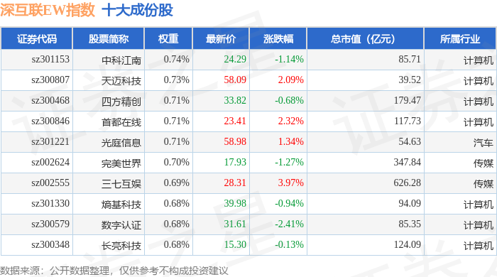 证券之星消息,1月21日,深互联EW(399677)指数报收于6189.75点,跌0.11%,成交984.72亿元,换手率4.49%。当日该指数成份股中,上涨的有61家,上海钢联以8.45%的涨幅领涨,下跌的有100家,方直科技以10.37%的跌幅领跌。