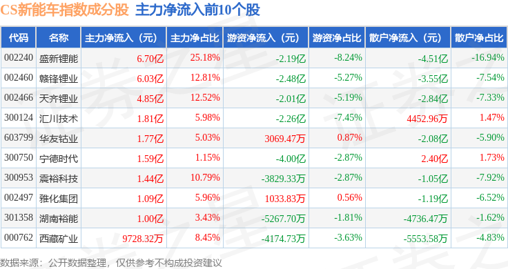 资金流向方面,CS新能车(399976)指数成份股当日主力资金净流入合计14.71亿元,游资资金净流出合计18.76亿元,散户资金净流入合计3.9亿元。成份股资金流向详情见下表: