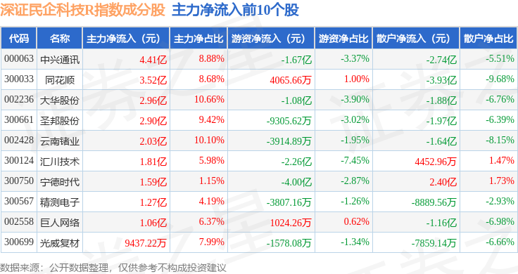 资金流向方面,深证民企科技R(470059)指数成份股当日主力资金净流入合计1.93亿元,游资资金净流出合计13.16亿元,散户资金净流入合计11.23亿元。成份股资金流向详情见下表: