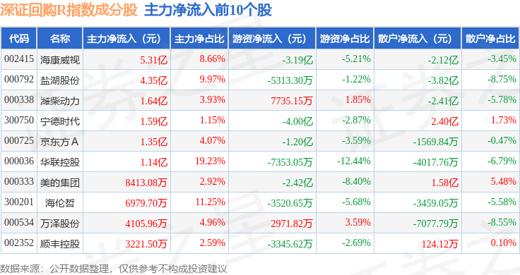 资金流向方面,深证回购R(470063)指数成份股当日主力资金净流入合计6.01亿元,游资资金净流出合计10.47亿元,散户资金净流入合计4.46亿元。成份股资金流向详情见下表: