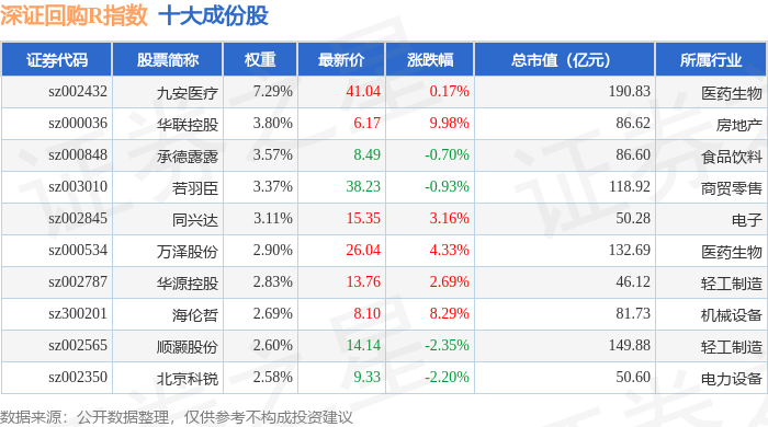 证券之星消息,1月21日,深证回购R(470063)指数报收于3516.08点,涨0.83%,成交629.48亿元,换手率2.29%。当日该指数成份股中,上涨的有27家,华联控股以9.98%的涨幅领涨,下跌的有23家,恒逸石化以2.4%的跌幅领跌。