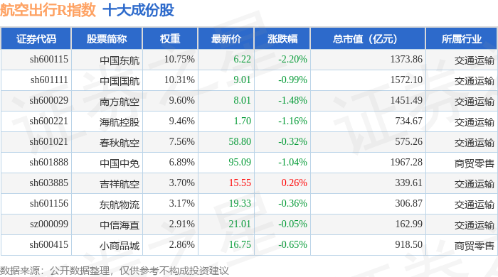证券之星消息,1月21日,航空出行R(480059)指数报收于1902.73点,跌0.95%,成交310.99亿元,换手率1.85%。当日该指数成份股中,上涨的有15家,华联控股以9.98%的涨幅领涨,下跌的有63家,风语筑以9.81%的跌幅领跌。