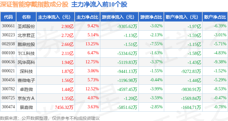 资金流向方面,深证智能穿戴(970074)指数成份股当日主力资金净流出合计7.54亿元,游资资金净流出合计10.8亿元,散户资金净流入合计18.33亿元。成份股资金流向详情见下表: