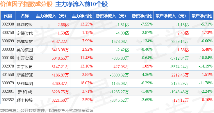 资金流向方面,价值因子(980056)指数成份股当日主力资金净流出合计1527.84万元,游资资金净流出合计10.25亿元,散户资金净流入合计10.4亿元。成份股资金流向详情见下表: