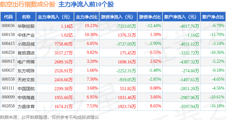 资金流向方面,航空出行(980059)指数成份股当日主力资金净流出合计4.93亿元,游资资金净流入合计3.82亿元,散户资金净流入合计1.12亿元。成份股资金流向详情见下表: