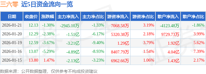 证券之星消息,截至2026年1月21日收盘,三六零(601360)报收于12.13元,下跌1.3%,换手率2.59%,成交量180.95万手,成交额22.17亿元。