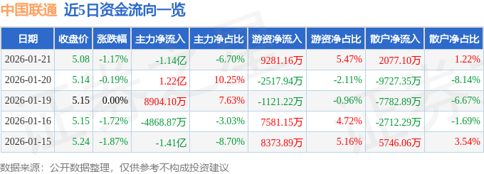 证券之星消息,截至2026年1月21日收盘,中国联通(600050)报收于5.08元,下跌1.17%,换手率1.08%,成交量332.32万手,成交额16.96亿元。