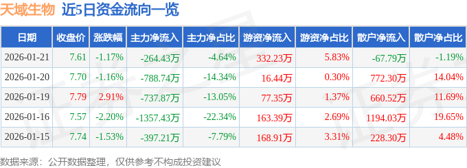 证券之星消息,截至2026年1月21日收盘,天域生物(603717)报收于7.61元,下跌1.17%,换手率2.59%,成交量7.51万手,成交额5698.38万元。