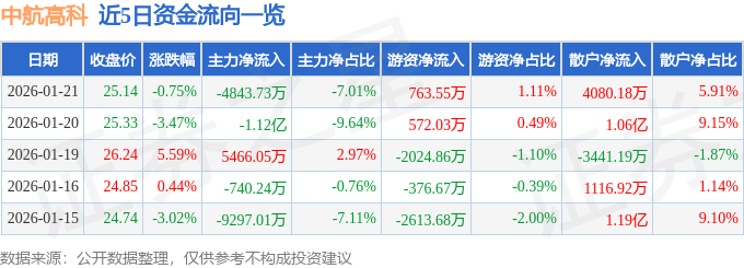 证券之星消息,截至2026年1月21日收盘,中航高科(600862)报收于25.14元,下跌0.75%,换手率1.96%,成交量27.31万手,成交额6.91亿元。