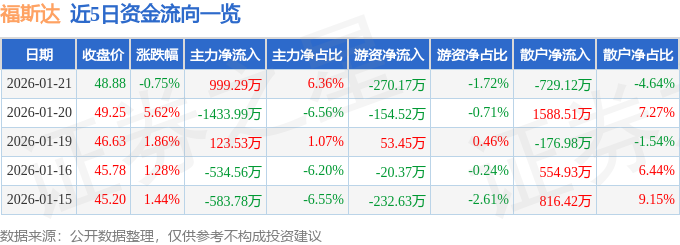 证券之星消息,截至2026年1月21日收盘,福斯达(603173)报收于48.88元,下跌0.75%,换手率6.6%,成交量3.27万手,成交额1.57亿元。