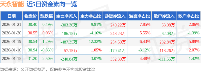 证券之星消息,截至2026年1月21日收盘,天永智能(603895)报收于30.4元,下跌0.49%,换手率0.93%,成交量1.01万手,成交额3059.19万元。