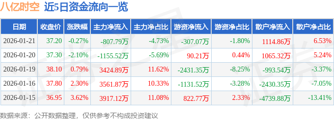 证券之星消息,截至2026年1月21日收盘,八亿时空(688181)报收于37.2元,下跌0.27%,换手率3.43%,成交量4.62万手,成交额1.71亿元。