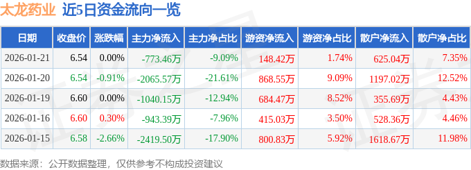 证券之星消息,截至2026年1月21日收盘,太龙药业(600222)报收于6.54元,上涨0.0%,换手率2.27%,成交量13.02万手,成交额8505.89万元。
