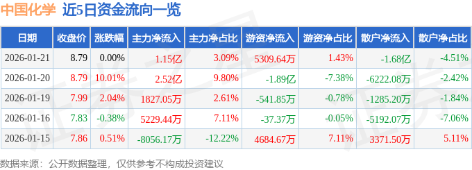证券之星消息,截至2026年1月21日收盘,中国化学(601117)报收于8.79元,上涨0.0%,换手率6.94%,成交量422.38万手,成交额37.26亿元。