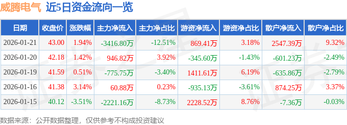 证券之星消息,截至2026年1月21日收盘,威腾电气(688226)报收于43.0元,上涨1.94%,换手率3.41%,成交量6.43万手,成交额2.73亿元。