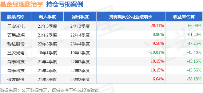 谢治宇管理的兴全社会价值三年持有混合基金在21年3季度买入三安光电,在持有3年又0个季度后在24年3季度卖出。持有期间的估算收益率为-66.08%,持有期间三安光电在2021年到2024年的年报营业总收入增幅达28.11%。