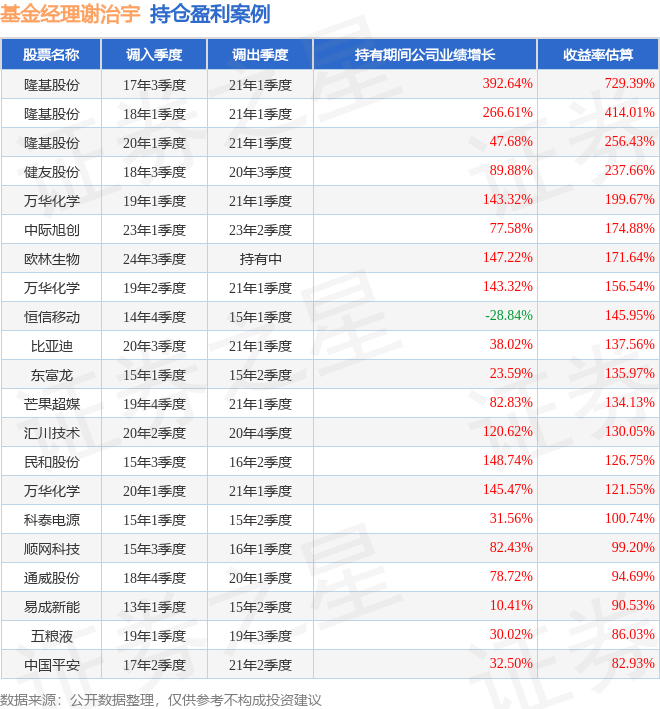 以下为谢治宇所任职基金的部分重仓股调仓案例: