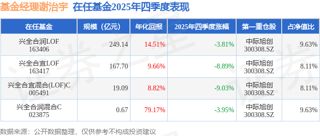 证券之星消息,截止2025年四季度末,基金经理谢治宇旗下共管理4只基金,本季度表现最佳的为兴全合润LOF(163406),季度净值跌3.81%。