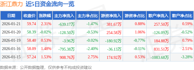 证券之星消息,截至2026年1月21日收盘,浙江鼎力(603338)报收于59.74元,上涨2.31%,换手率1.44%,成交量7.31万手,成交额4.33亿元。