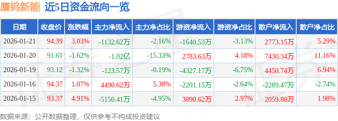 证券之星消息,截至2026年1月21日收盘,厦钨新能(688778)报收于94.39元,上涨3.03%,换手率1.11%,成交量5.62万手,成交额5.24亿元。