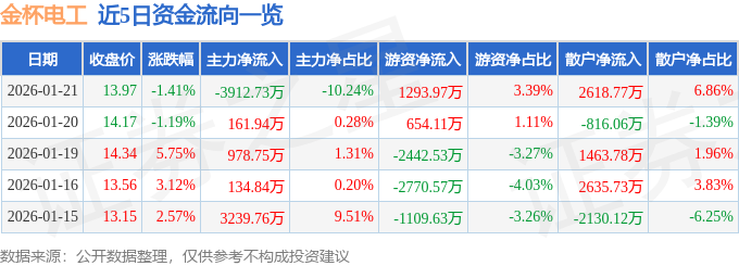 证券之星消息,截至2026年1月21日收盘,金杯电工(002533)报收于13.97元,下跌1.41%,换手率4.27%,成交量27.21万手,成交额3.82亿元。