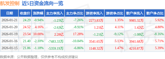 证券之星消息,截至2026年1月21日收盘,航发控制(000738)报收于24.29元,下跌0.94%,换手率5.28%,成交量69.43万手,成交额16.88亿元。
