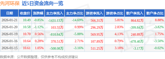 证券之星消息,截至2026年1月21日收盘,先河环保(300137)报收于10.49元,下跌0.85%,换手率1.75%,成交量9.26万手,成交额9740.32万元。