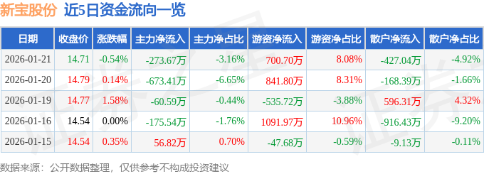 证券之星消息,截至2026年1月21日收盘,新宝股份(002705)报收于14.71元,下跌0.54%,换手率0.73%,成交量5.89万手,成交额8671.38万元。