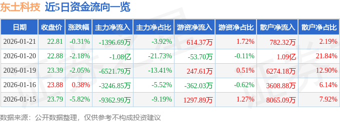 证券之星消息,截至2026年1月21日收盘,东土科技(300353)报收于22.81元,下跌0.31%,换手率2.9%,成交量15.57万手,成交额3.56亿元。