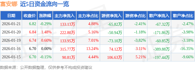 证券之星消息,截至2026年1月21日收盘,富安娜(002327)报收于6.82元,下跌0.29%,换手率0.82%,成交量4.01万手,成交额2729.74万元。
