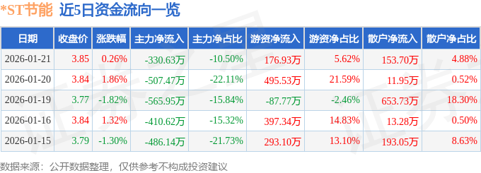 证券之星消息,截至2026年1月21日收盘,*ST节能(000820)报收于3.85元,上涨0.26%,换手率2.74%,成交量8.13万手,成交额3149.88万元。