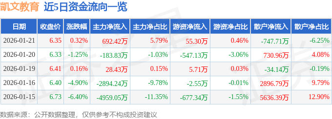 证券之星消息,截至2026年1月21日收盘,凯文教育(002659)报收于6.35元,上涨0.32%,换手率3.16%,成交量18.9万手,成交额1.2亿元。