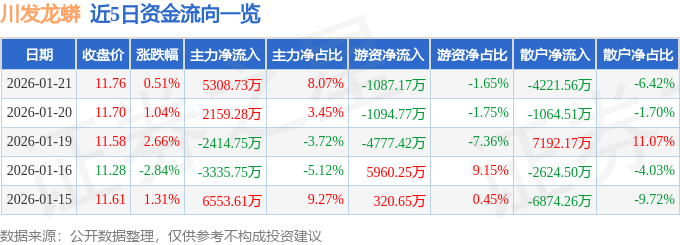 证券之星消息,截至2026年1月21日收盘,川发龙蟒(002312)报收于11.76元,上涨0.51%,换手率2.97%,成交量55.98万手,成交额6.58亿元。