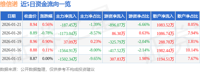 证券之星消息,截至2026年1月21日收盘,维信诺(002387)报收于8.94元,上涨0.56%,换手率1.08%,成交量15.07万手,成交额1.35亿元。