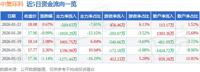 证券之星消息,截至2026年1月21日收盘,中集环科(301559)报收于18.08元,上涨0.67%,换手率4.59%,成交量4.14万手,成交额7448.45万元。