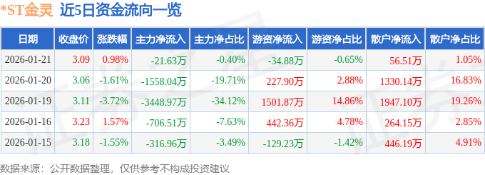 证券之星消息,截至2026年1月21日收盘,*ST金灵(300091)报收于3.09元,上涨0.98%,换手率1.19%,成交量17.58万手,成交额5404.65万元。