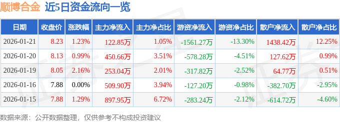 证券之星消息,截至2026年1月21日收盘,顺博合金(002996)报收于8.23元,上涨1.23%,换手率3.54%,成交量14.38万手,成交额1.17亿元。