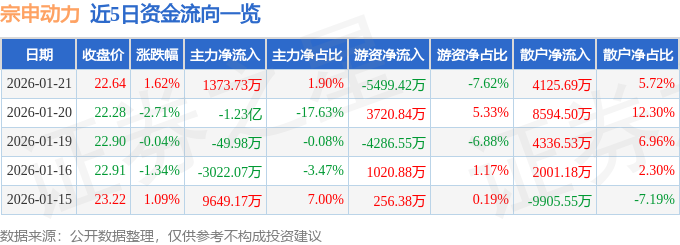证券之星消息,截至2026年1月21日收盘,宗申动力(001696)报收于22.64元,上涨1.62%,换手率3.56%,成交量31.71万手,成交额7.22亿元。