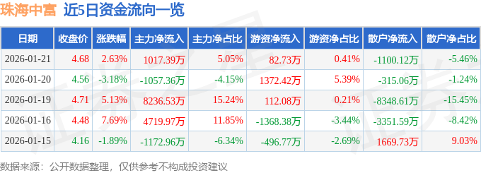 证券之星消息,截至2026年1月21日收盘,珠海中富(000659)报收于4.68元,上涨2.63%,换手率3.38%,成交量43.49万手,成交额2.02亿元。