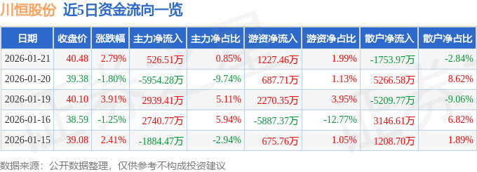 证券之星消息,截至2026年1月21日收盘,川恒股份(002895)报收于40.48元,上涨2.79%,换手率2.58%,成交量15.39万手,成交额6.17亿元。
