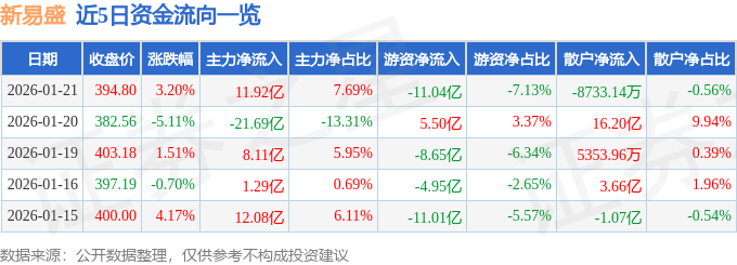 证券之星消息,截至2026年1月21日收盘,新易盛(300502)报收于394.8元,上涨3.2%,换手率4.42%,成交量39.18万手,成交额154.93亿元。