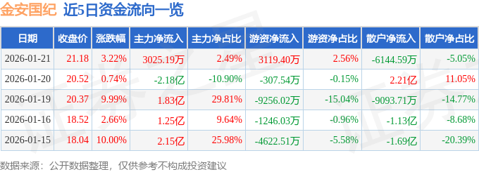 证券之星消息,截至2026年1月21日收盘,金安国纪(002636)报收于21.18元,上涨3.22%,换手率7.99%,成交量57.84万手,成交额12.17亿元。